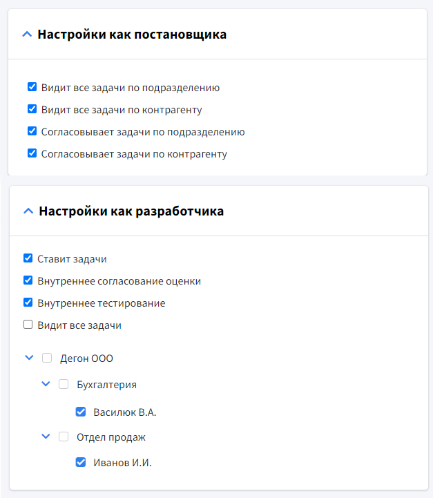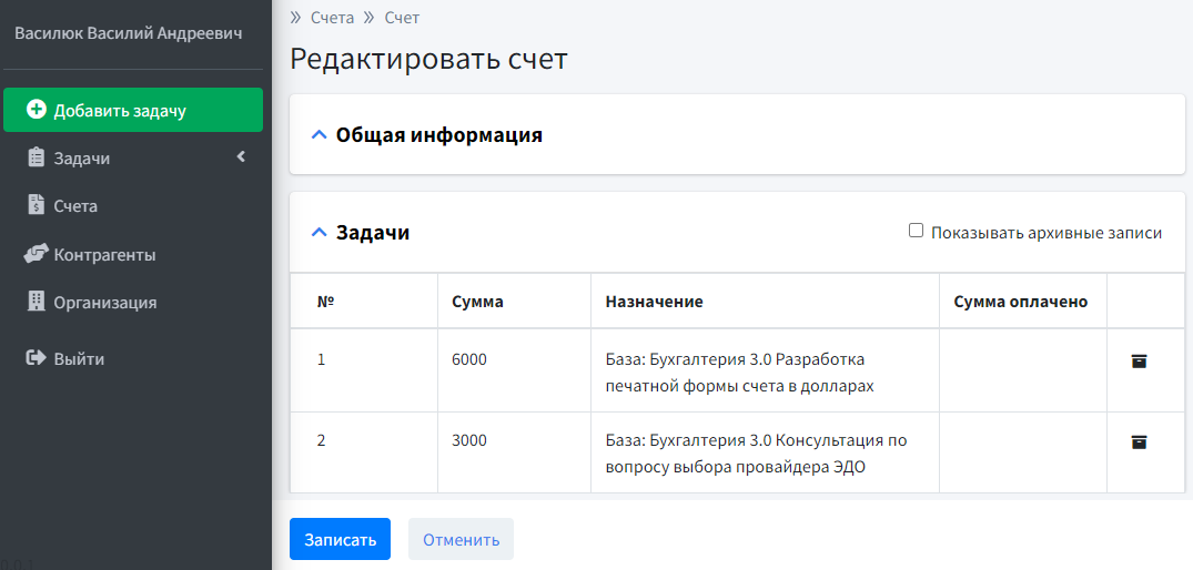 - Аналитика по количеству и стоимости задач в разрезе пользователей и подразделений